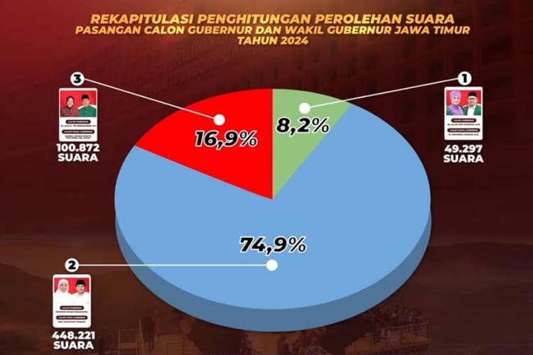 Pasangan ini berhasil mengumpulkan 448.221 suara atau setara dengan 74,9 persen dari total suara sah. Di posisi kedua, pasangan Tri Rismaharini (Risma) dan Gus Hans memperoleh 100.872 suara atau 16,9 persen. Sementara itu, paslon nomor urut 3, Luluk-Lukman, menempati posisi terakhir dengan 49.297 suara atau 8,2 persen.