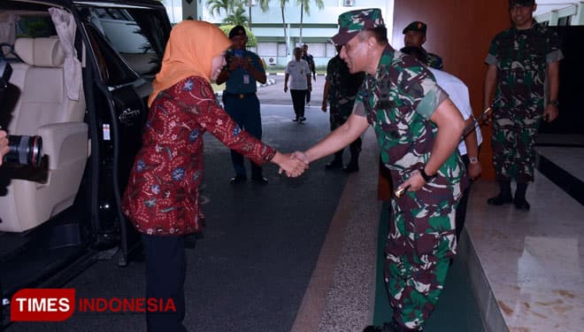 TIMES Probolinggo/Pangdam V/Brawijaya, Mayjen TNI Wisnoe, P.B, menyambut kedatangan Gubernur Jatim, Khofifah Indar Parawansa di Makodam V/Brawijaya, Rabu (20/2/2019).(Foto: Istimewa)